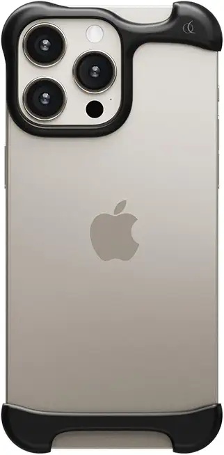 Minimalist case for iPhone 16 Pro (2024, 6.3 inch) in Matte Black aluminum. Aerospace-grade protection with elastomer inlays – slim profile and excellent drop resistance for the smaller Pro model.